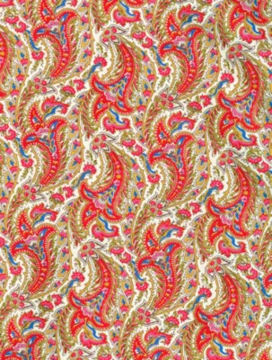 This is what I wore today. These Boden pants look red here, but they are actually what Crayola crayon used to call red-orange, or maybe even orange-red. Anyway, they are a beautiful, saturated orange color. I'm loving them with the paisley shirt (the picture is very washed out, it's actually the gorgeous print below). I am so in love with this jean jacket that I dyed cobalt blue this summer. It looked amazing with this outfit -- I got many compliments today.